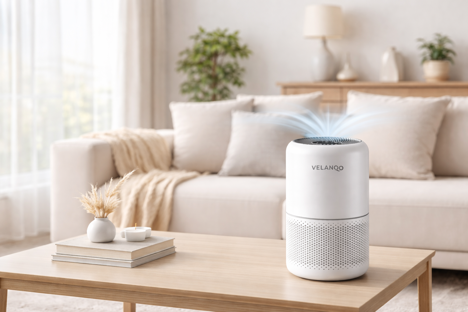 This Velanqo air purifier uses a multi-layer filtration system designed to help reduce common airborne particles such as dust, pet dander, and household odors. Built for consistent performance, it’s suitable for everyday use in living rooms, bedrooms, and shared home spaces.