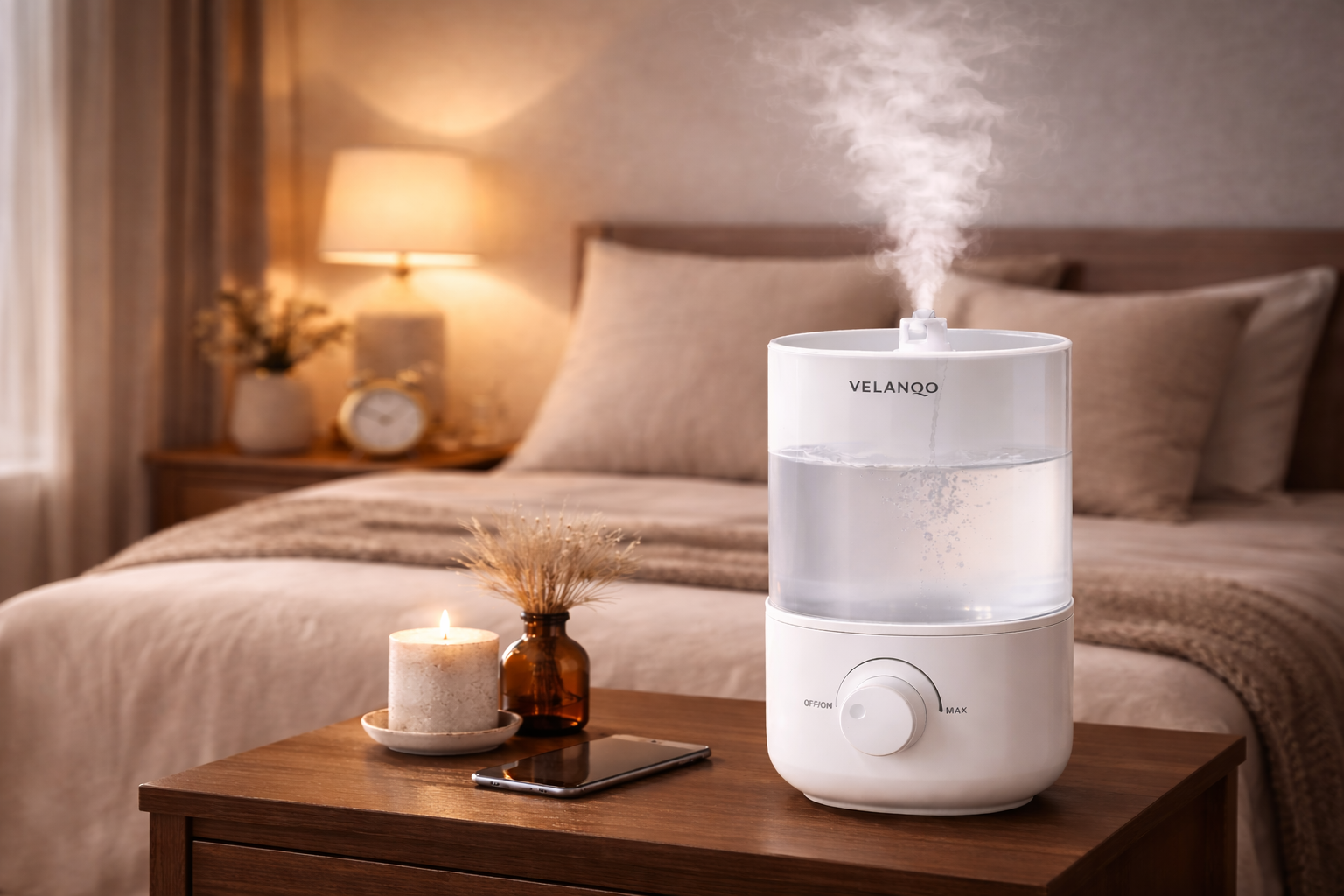 This Velanqo humidifier is designed for consistent mist output and easy everyday use. With a compact footprint and straightforward controls, it fits naturally into bedrooms, offices, and living spaces without distraction.